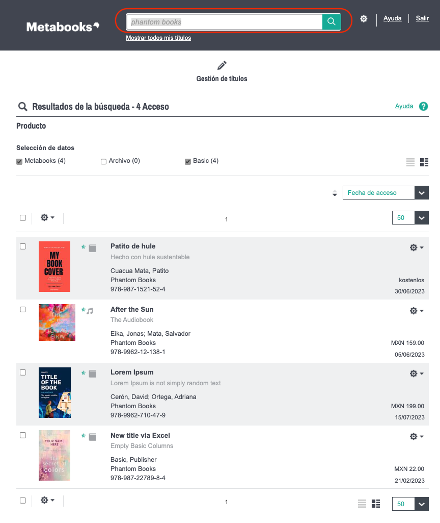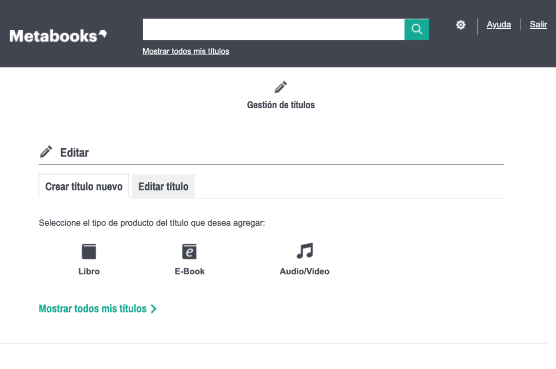Como Editorial, los títulos están disponibles solo para quien los registró. Su búsqueda se limita a “Metabooks” (todos los títulos activos de su editorial en Metabooks) y “Archivo” (todos los títulos archivados de su editorial).