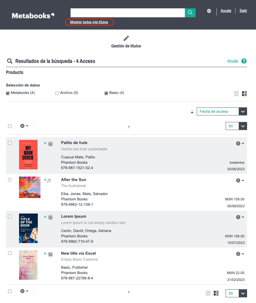 En esta opción podrás consultar todos los productos de tu catálogo editorial que hayas cargado en Metabooks basic.