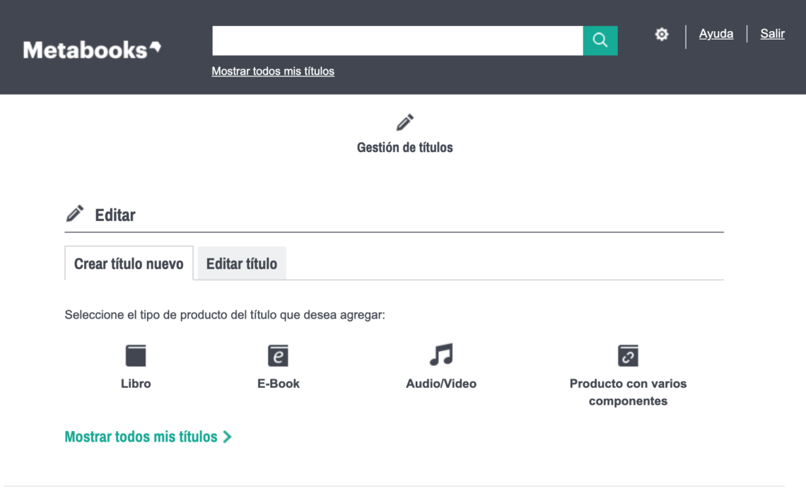 Para registrar un título en Metabooks basic, debes acceder al formulario de captura en la sección Gestión de títulos y seleccionar el tipo de producto que quieras registrar.
