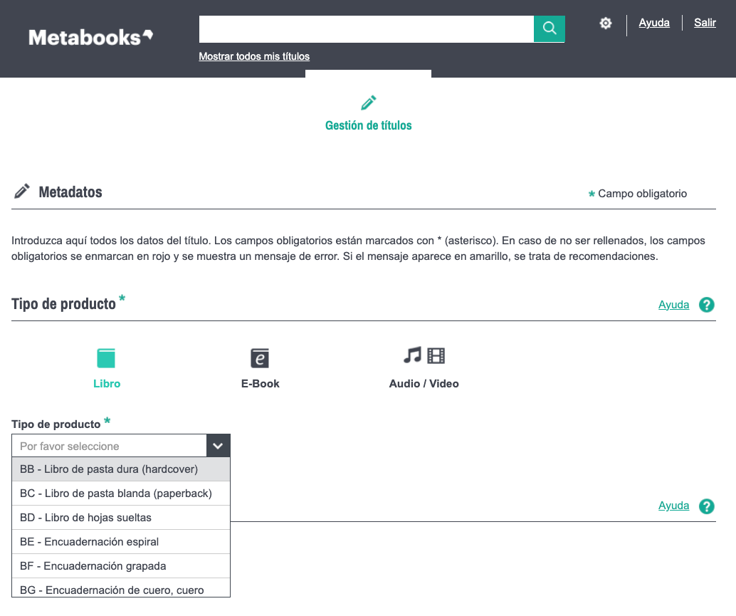 El tipo de producto debe ser determinado al registrar un nuevo título. Al seleccionar una de las opciones de formato en la sección Gestión de títulos, se habilitará el formulario de captura correspondiente para el nuevo registro.
