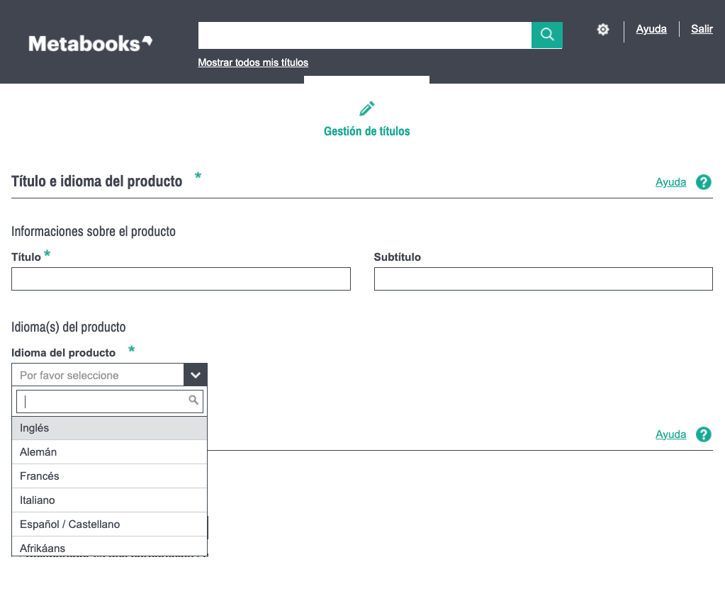 El título del libro forma parte de los metadatos indispensables para cargar tu producto en Metabooks basic. En este bloque también debe ser registrado el idioma del producto. Puedes seleccionar uno de los idiomas precargados en el listado desplegable de este campo.