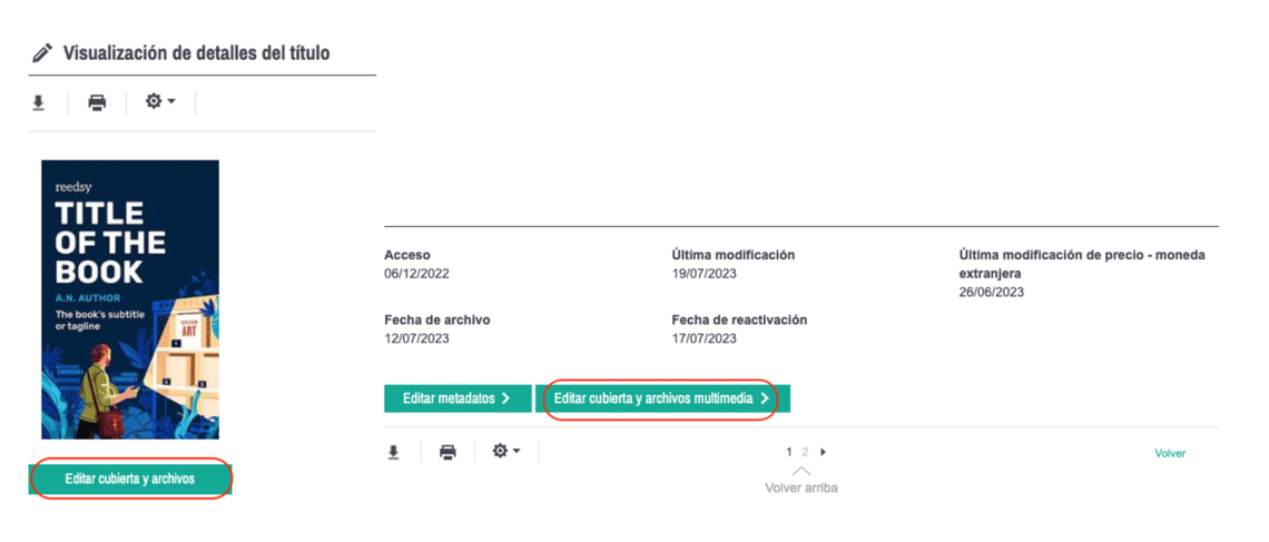 Puedes hacerlo desde la ficha técnica dando clic en algunos de los botones «Editar cubierta y archivos» (Al inicio, debajo de la miniatura de la imagen de la cubierta) o «Editar cubierta y archivos multimedia» (Al final, junto al botón «Editar metadatos»).