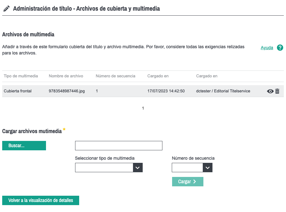 En el gestor de «Archivos de cubierta y multimedia», basta con dar clic en el botón «Buscar...» para elegir el archivo almacenado en nuestra computadora, elegirlo, seleccionar el tipo de multimedia en el listado precargado y asignar el número de secuencia cuando se trate de más un archivo con las mismas características y dar clic en el botón «Cargar».