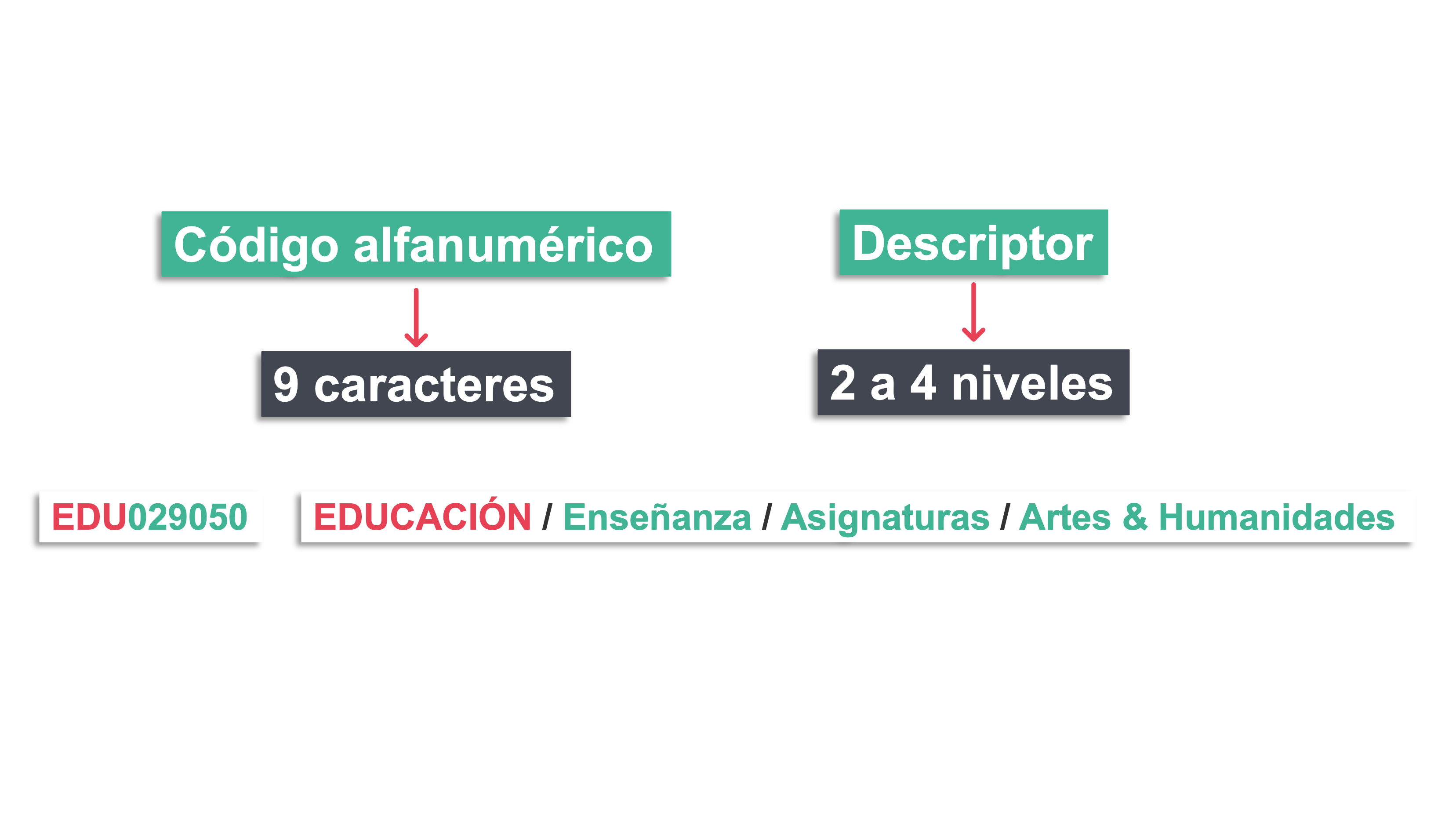 Por ejemplo, el código que representa en general a la categoría “viaje al sur de los Estados Unidos” queda expresado como TRV025070, y su descriptor relacionado es “VIAJES / Estados Unidos / Sur / General”. En este caso, el descriptor consta de cuatro niveles jerárquicos.