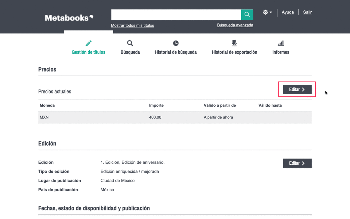 ¡Recuerda! Ambos campos, tanto el precio de venta como el estado de disponibilidad son campos obligatorios para que un título ingrese a Metabooks, pero es crucial mantenerlos actualizados.