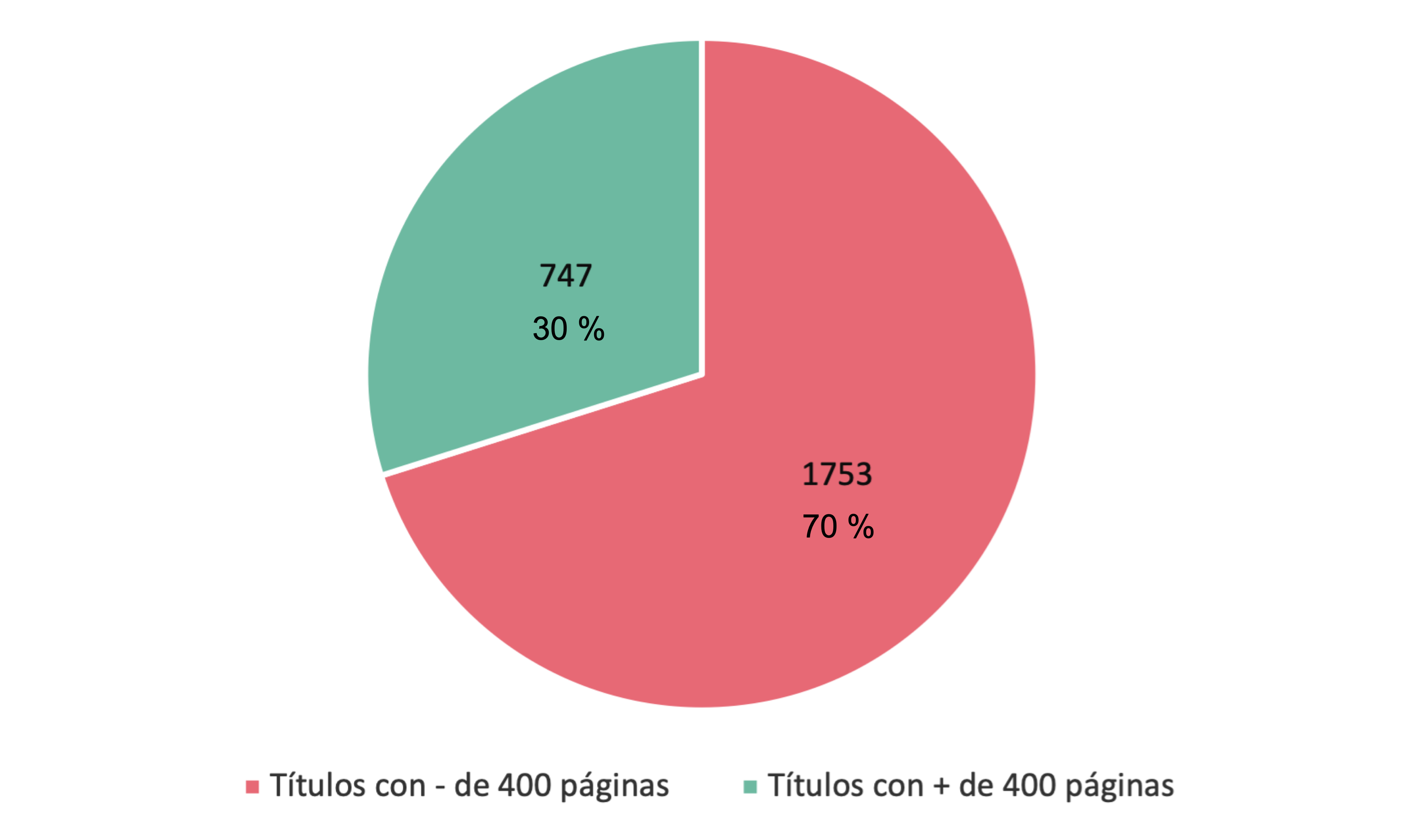 En total, se obtuvieron 2500 títulos que cumplían con los criterios de búsqueda antes mencionados y de los cuales, 70% registran un número de páginas menor a 400, mientras que el 30% restante tiene un número entre 405 a 990 páginas. Con base en estos resultados, la longitud promedio de los libros impresos activos en Metabooks con código BISAC FIC000000 (Ficción/General) es de 347 páginas. Es decir, en el mercado mexicano predominan los libros “cortos”, según el criterio de WordRated, al menos para la ficción.
