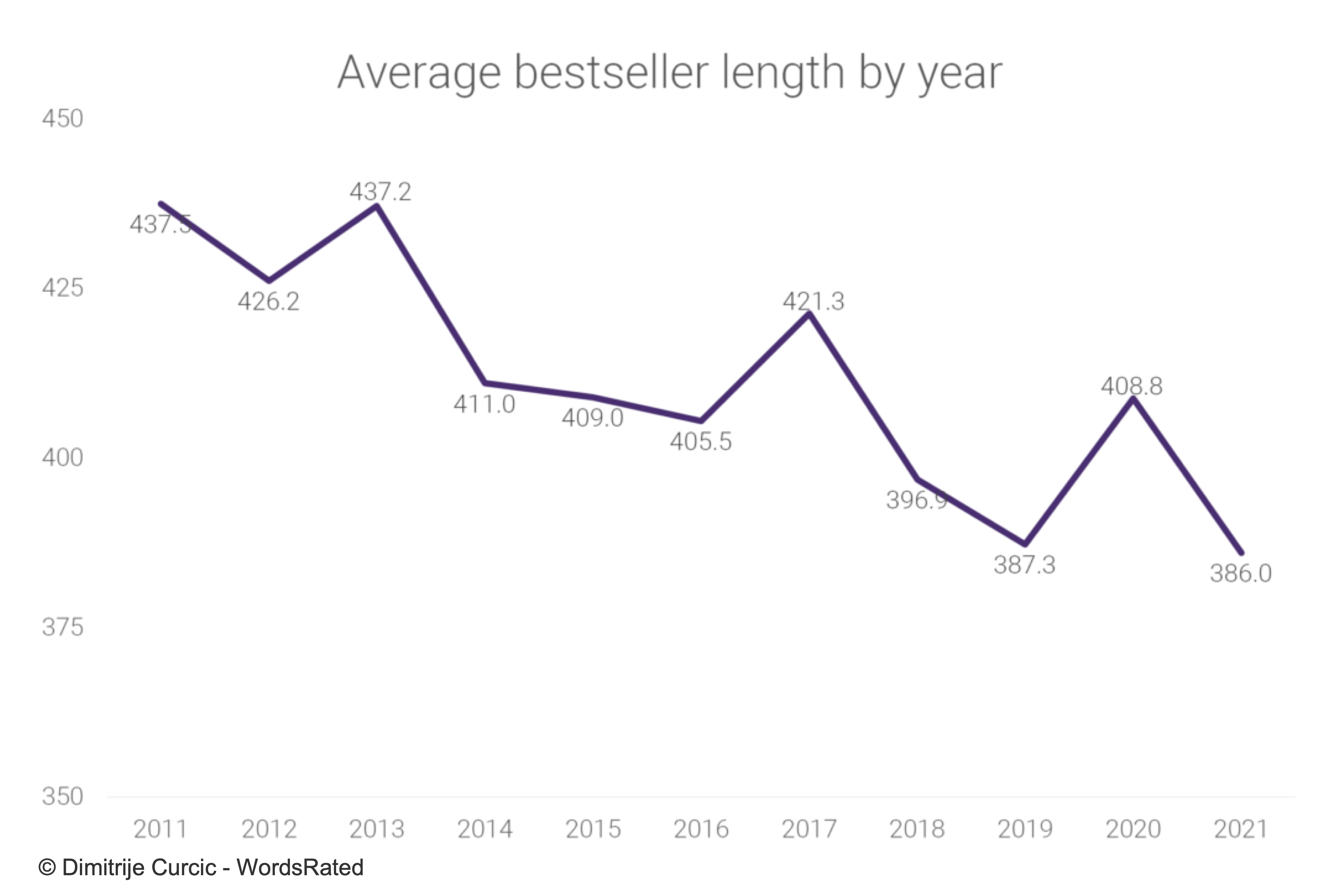 - Los bestsellers son cada vez más cortos: la longitud media de un libro enlistados en la clasificación de lo más vendidos del NYT ha disminuido en 51,5 páginas de 2011 a 2021, pasando de 437.5 a 386 páginas en promedio (11.8%).